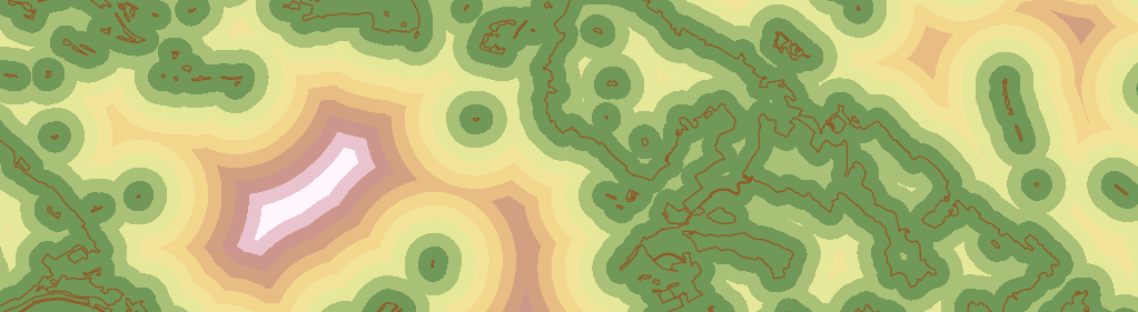 Berechne nun als ersten Schritt für den gesamten Untersuchungsraum den Abstand zur nächstgelegenen Waldrandlinie. Nutze hierfür das Geoverarbeitungswerkzeug “Euclidean Distance”. Lege die Output Cell Size auf 1 Meter fest und definiere in den Environments das Output Coordinate System und den Raum in dem diese globale Rasterfunktion ausgeführt wird (Extent = Untersuchungsgebiet).