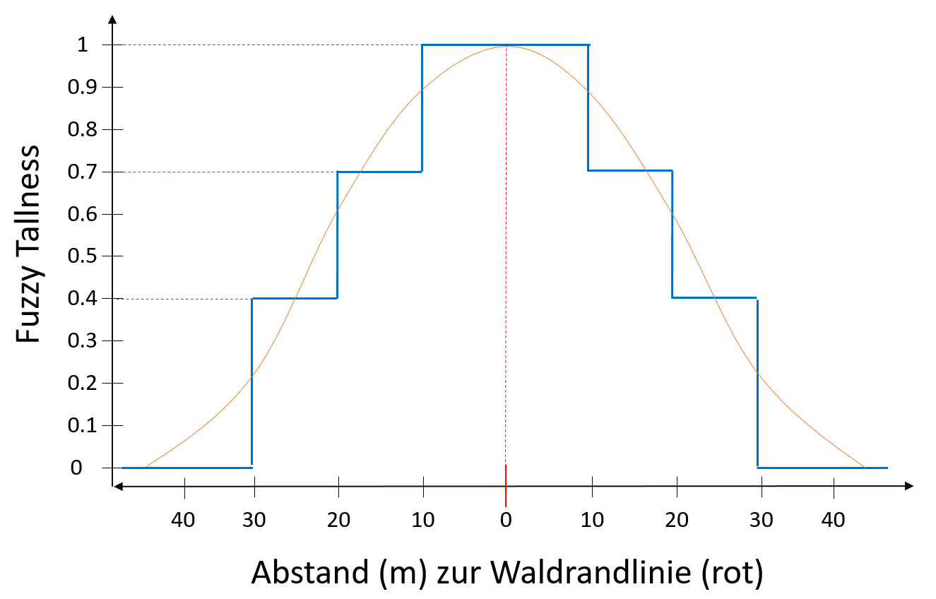 Nun wollen wir diese Unschärfe des Konzepts Waldrand noch erweitern und die grenzscharfe Pufferdistanz aus der vorigen Übung mit einer graduellen Zugehörigkeit (membership function) ersetzen. Hierfür sollen folgende Fuzzy Tallness Werte definiert werden (vgl. Abbildung): Abstand zu Waldrandlinie: