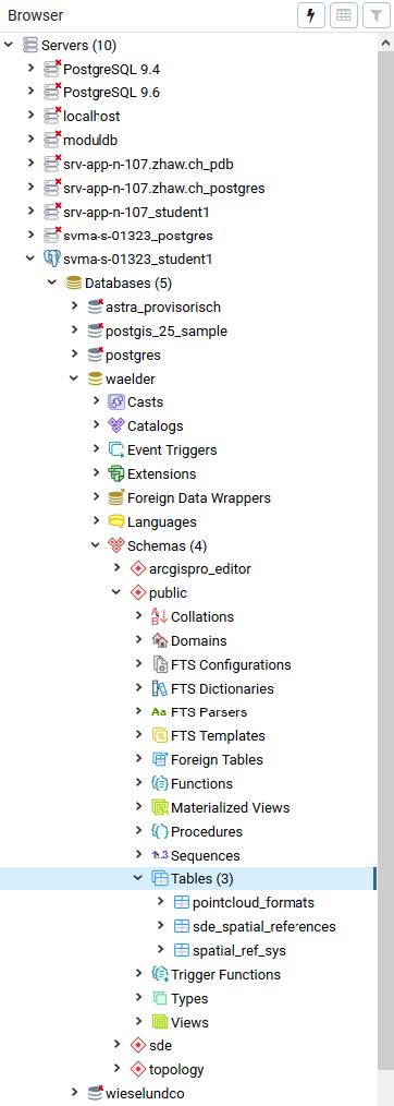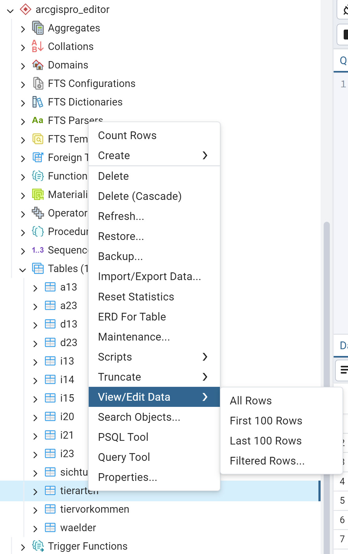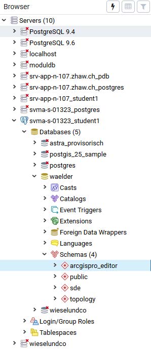 - Starten Sie pgAdmin und laden die Datenbank “waelder” im Schema “arcgispro_editor”