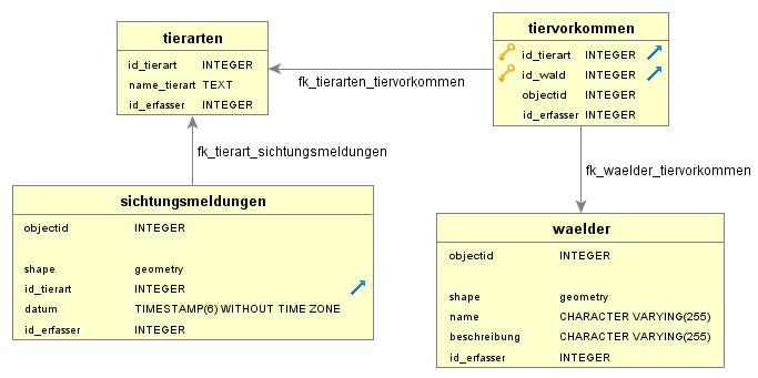 Für die kommenden Übungen nutzen wir die Datenbank “waelder” auf unserem Server. Den Zugriff haben wir in den vorigen Übungen eingerichtet. Um einen Überblick zu bekommen, lesen Sie das folgende Datenbankschema und machen sich mit den Tabellen, Attributen und Abhängigkeiten vertraut. Da Sie jetzt alle gemeinsam dieselben Tabellen bearbeiten, gibt es in jeder Tabelle jeweils ein Feld “id_erfasser”. Sobald Sie Tabellen mit Daten befüllen, schreiben Sie bitte immer jeweils Ihre studentNr in das Feld “id_erfasser”, damit die Einträge später unterscheidbar sind.