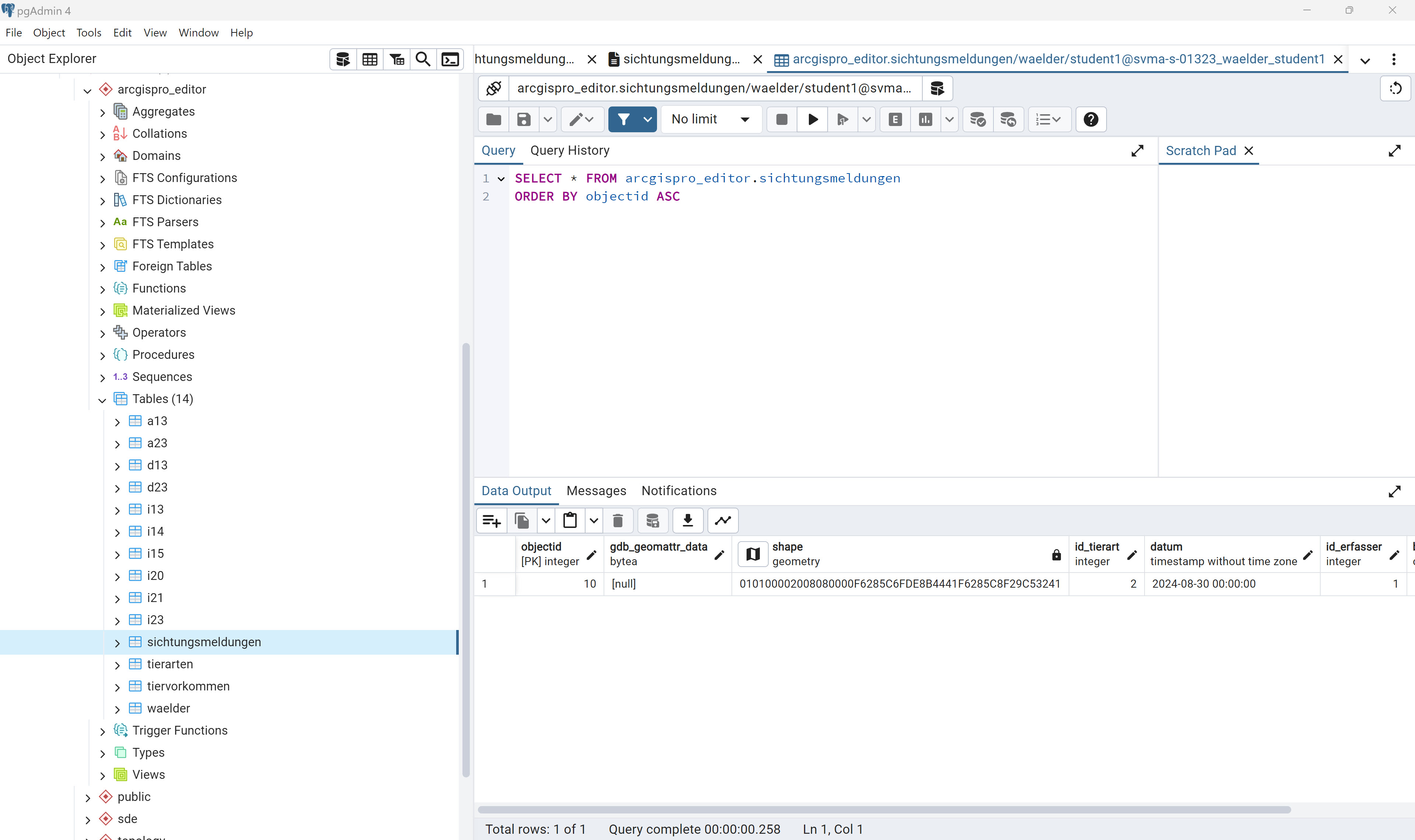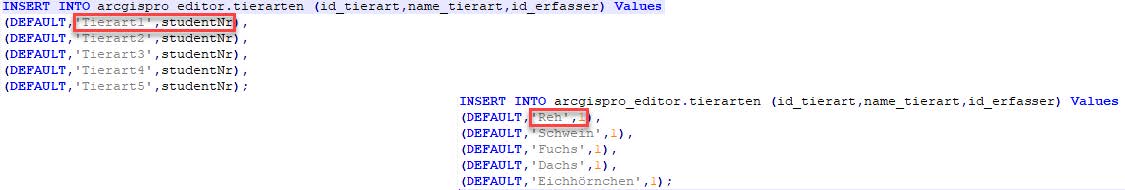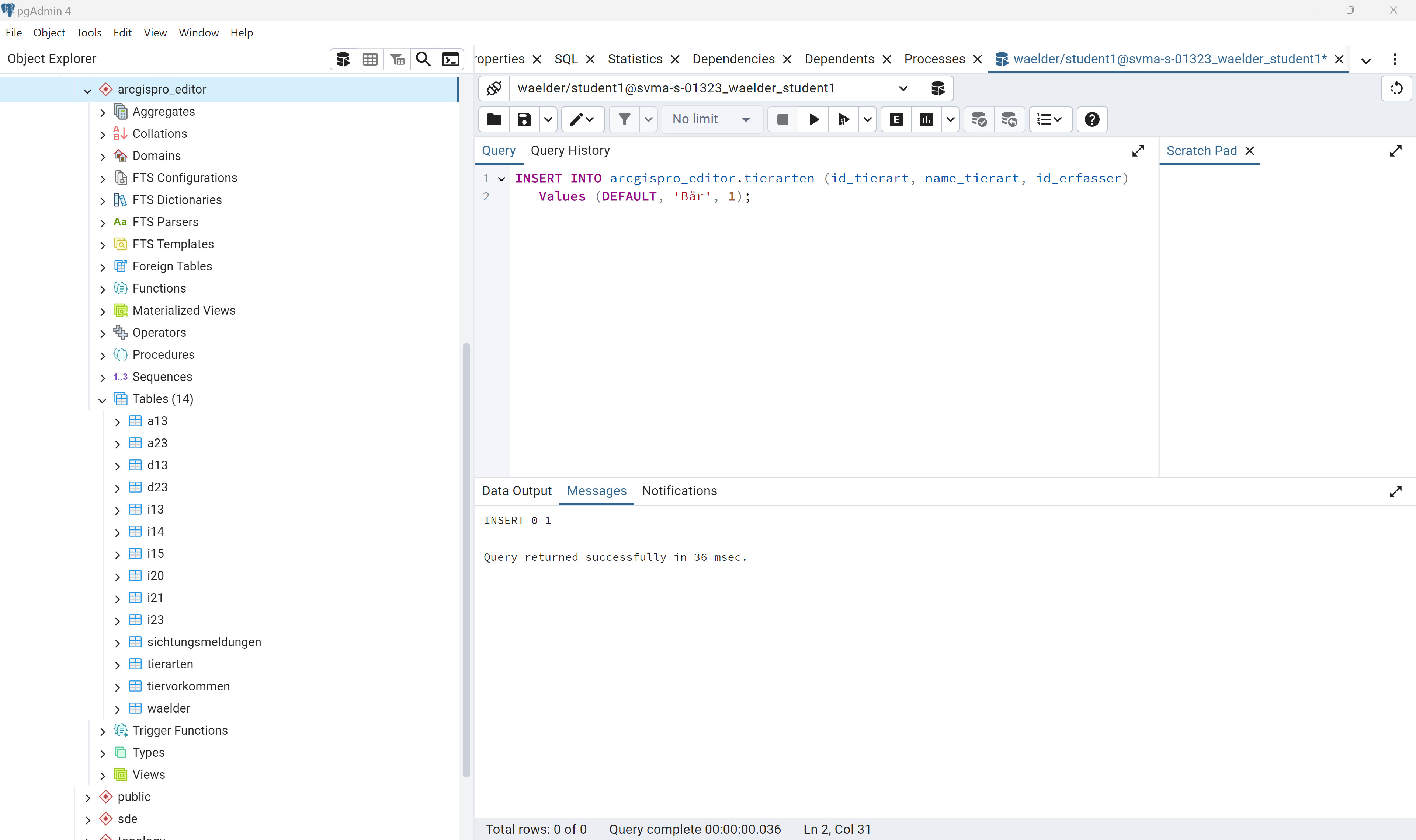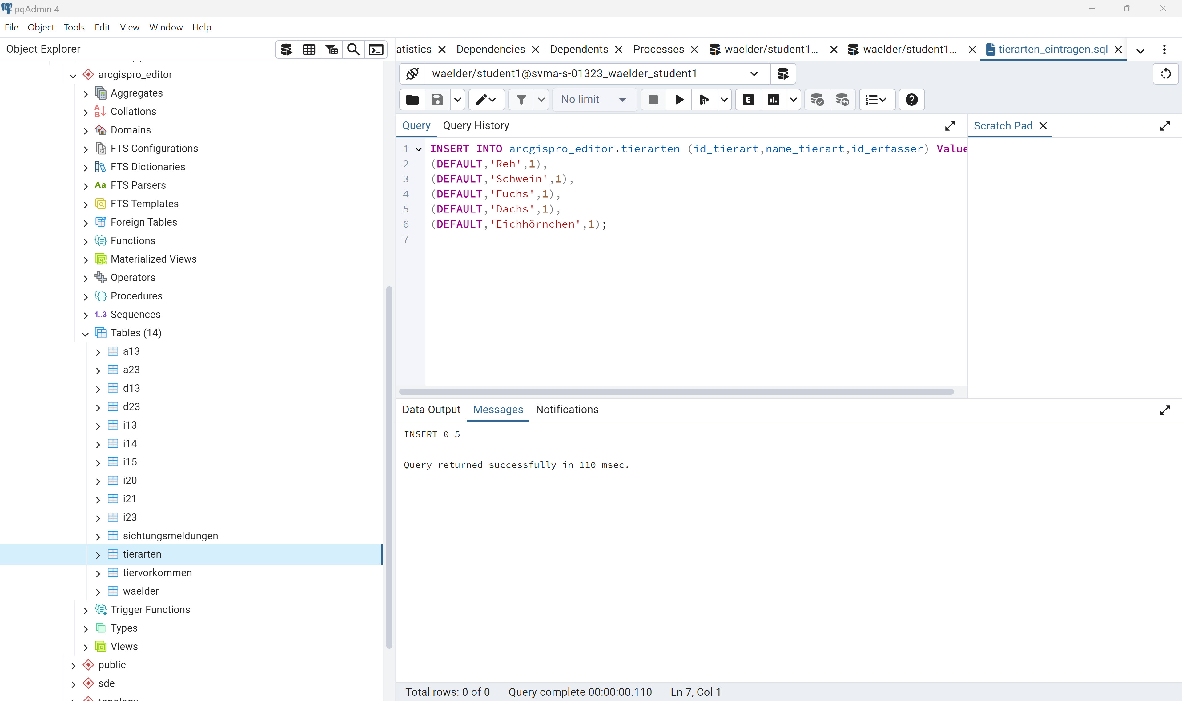 INSERT INTO arcgispro_editor.tierarten (id_tierart, name_tierart, id_erfasser) Values (DEFAULT, 'Bär', studentNr);- Schliessen Sie die Eingabe mit Klick auf Execute ab.