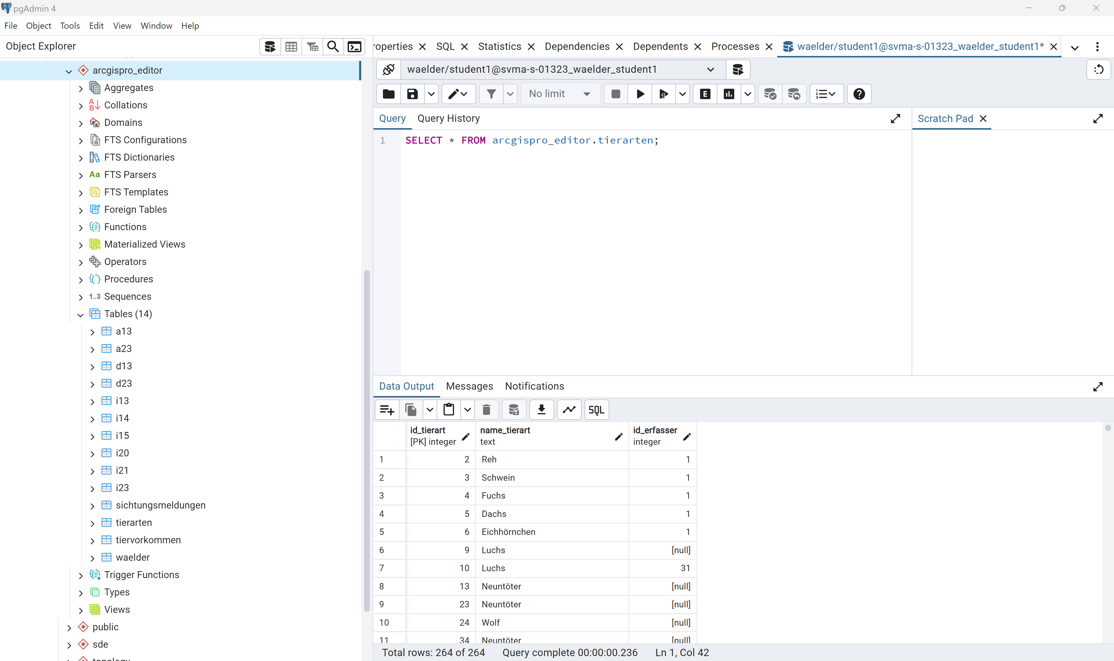 - Navigieren Sie im Object Explorer von pgAdmin zur Tabelle “tierarten”.
