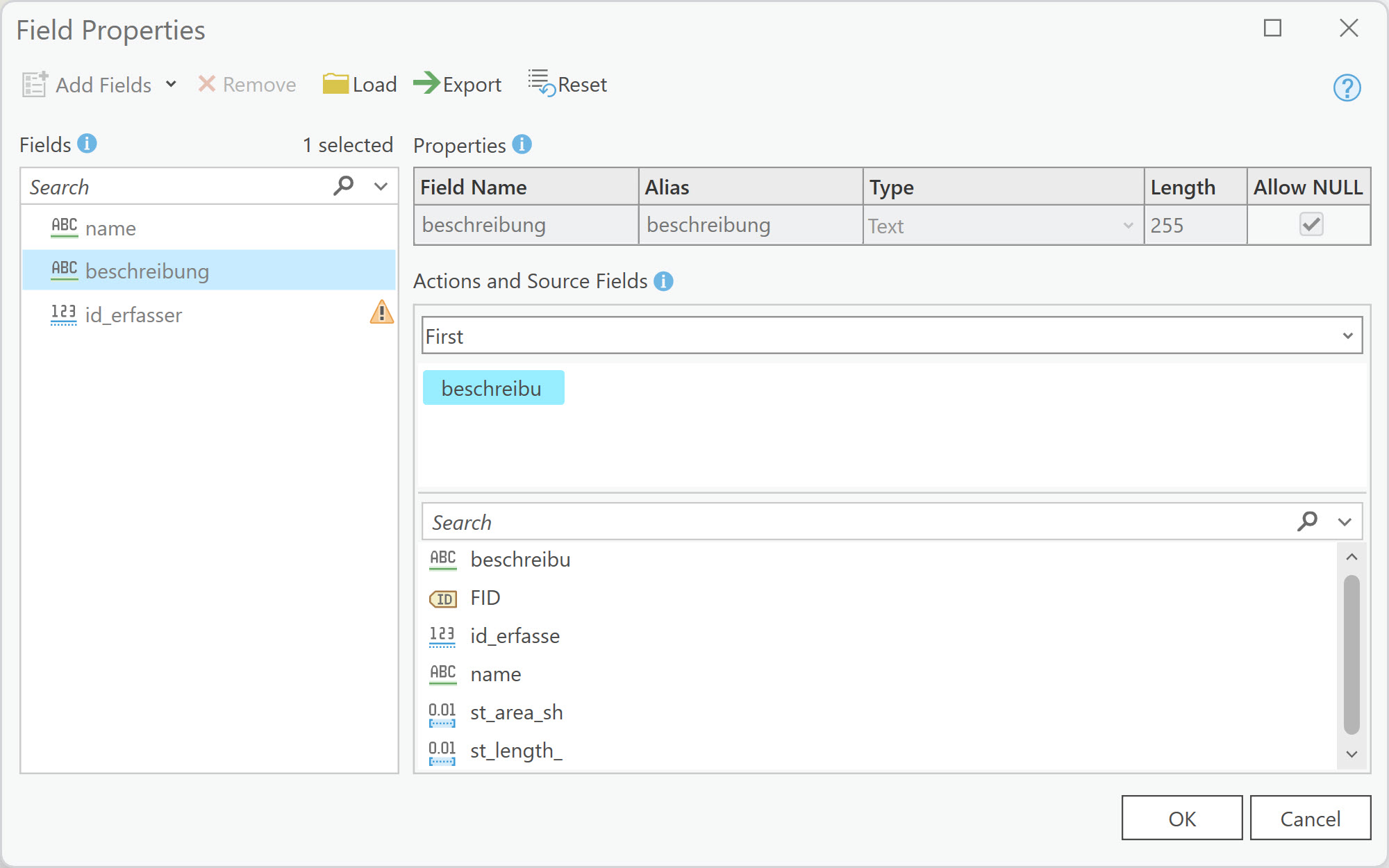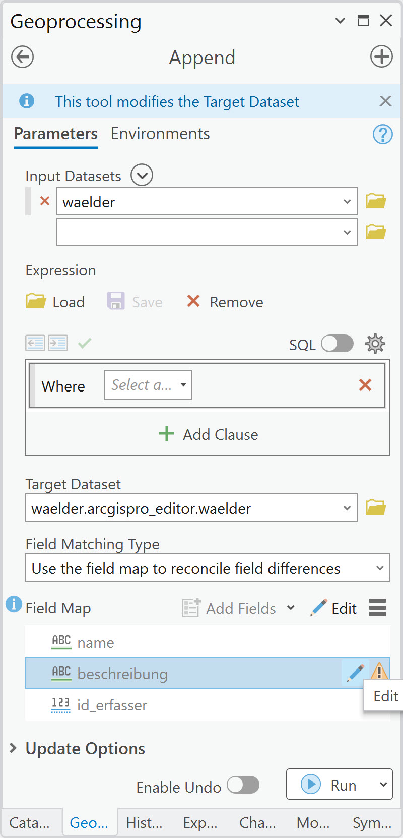 - Field Matching Type: Use the Field Map to reconcile schema differences. Shapefiles können nur Spaltenbezeichnungen mit 10 Zeichen speichern. Alles andere wird abgeschnitten. Das Attribut “beschreibung” ist deshalb in der Datenbank als “beschreibung” gespeichert, im Shapefile aber nur als “beschreibu”. Dies hat zur Folge, dass das Schema beider Feature Classes nicht gleich ist. Aus diesem Grund muss hier explizit die Übereinstimmung der Spalten bestimmt werden. Mit dem kleinen Stiftsymbol können Sie die Felder anpassen bzw. zuweisen. (siehe Abbildung 9.14) Das gleiche gilt für das Feld “id_erfasser” bzw. “id_erfasse” (siehe Abbildung 9.15).