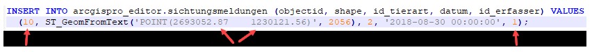Achten Sie darauf, dass Text immer in einfache Anführungszeichen (Das Zeichen auf der ?- Taste) gesetzt werden muss. Bei Copy & Paste aus Dateien wird oft das Anführungszeichen verändert.Beachten Sie ausserdem die Punktschreibweise, dabei muss der Name des Schemas “arcgispro_editor” immer mit Punkt verbunden vor dem Namen der Tabelle angegeben werden. Jedes Statement wird mit Semikolon abgeschlossen.