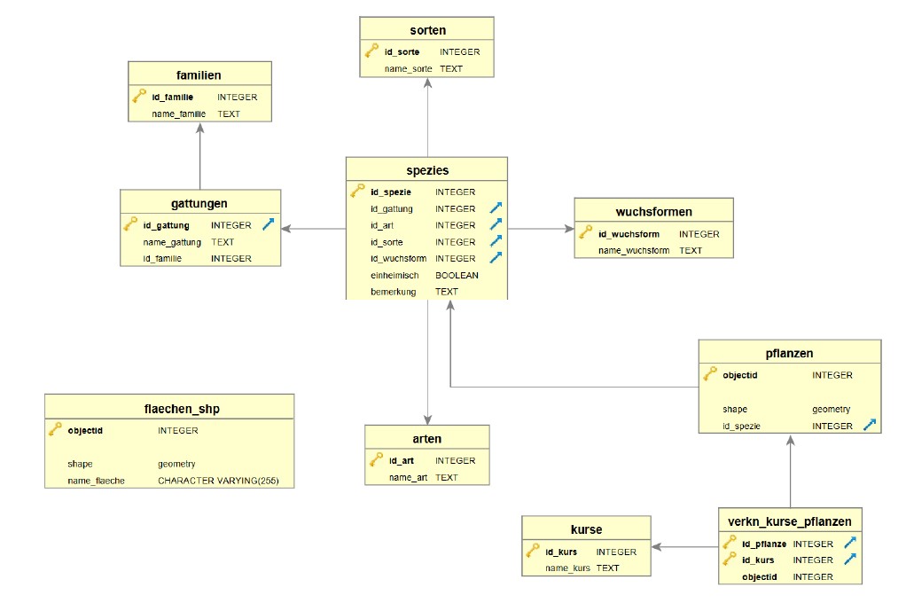 In den nächsten Übungen wollen wir mit den Daten in unserer Beispiel-Datenbank umgehen (siehe Abbildung 14.1). Dazu versuchen wir die Daten aus den einzelnen Tabellen zu verknüpfen und sinnvoll aufzubereiten, um Sie anschliessend im ArcGIS Pro einzubinden und zu visualisieren. Unsere Pflanzendatenbank hat hierbei immer den Namen “modulagi_pdb”. Verwenden Sie, wenn nicht anders angegeben diese Datenbank. Erstellen Sie zunächst noch einen beliebigen Ordner auf Ihrem Rechner in welchem wir die jeweiligen Ergebnisse speichern können. Sie finden ein Datenbankschema der Pflanzendatenbank auf dem Moodle. Dies hilft Ihnen beim Verständnis der Datenbank und seinen Beziehungen. Nutzen Sie auch die PostGIS Referenz, um die PostGIS Funktionen zu verstehen.