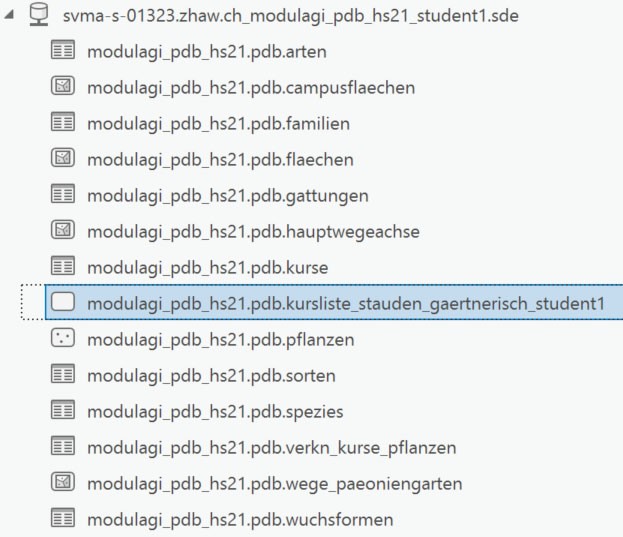 - Machen Sie eine Liste mit allen Pflanzen des Kurses “UÖ Stauden Gärtnerisch”. Die Liste soll dabei die ID der Spezies, die Gattung, Art und Sorte der Pflanze sowie den Namen des Kurses und den Standort (Attribut shape) enthalten. Speichern Sie diese Abfrage als View mit dem Namen “pdb.view_kursliste_stauden_gaertnerisch_studentNr” in der Datenbank. (CREATE VIEW … AS SELECT…) (siehe Abbildung 14.4).
