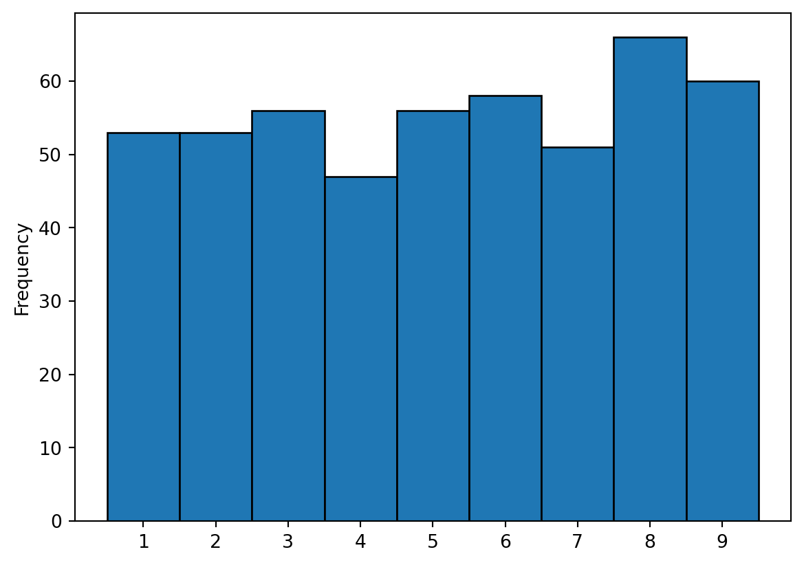 Wenn wir auf diese Weise mit randrange() immer wieder neue Zufallszahlen generieren fällt auf, dass die Verteilung der Zahlen ziemlich gleichmässig ist. Es ist also gleich wahrscheinlich eine 9 zu bekommen, wie eine 1 oder eine 5. Die Zahlen kommen also aus einer “uniformen” Verteilung. Um dies zu verdeutlichen generiere ich in den folgenden Codezeilen 500 Zufallszahlen zwischen 1 und 9 mit der Funktion randrange und visualisiere die Häufigkeit der einzelnen Zahlen in einem Histogramm.