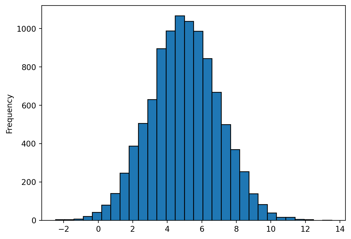 pd.Series(b).plot(kind = "hist", bins = 30, edgecolor = "black")