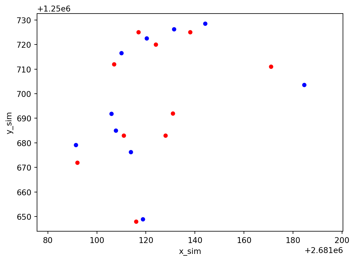Um die Original x/y-Werte sowie die simulierten Daten im gleichen Plot darzustellen, wird folgendermassen vorgegangen: Der erste Datensatz wird mit .plot() visualisiert, wobei der Output einer Variabel (z.B. basemap) zugewiesen wird. Danach wird der zweite Datensatz ebenfalls mit .plot() visualisiert, wobei auf den ersten Plot via dem Argument ax verwiesen wird.