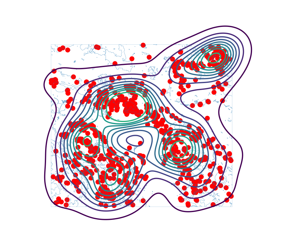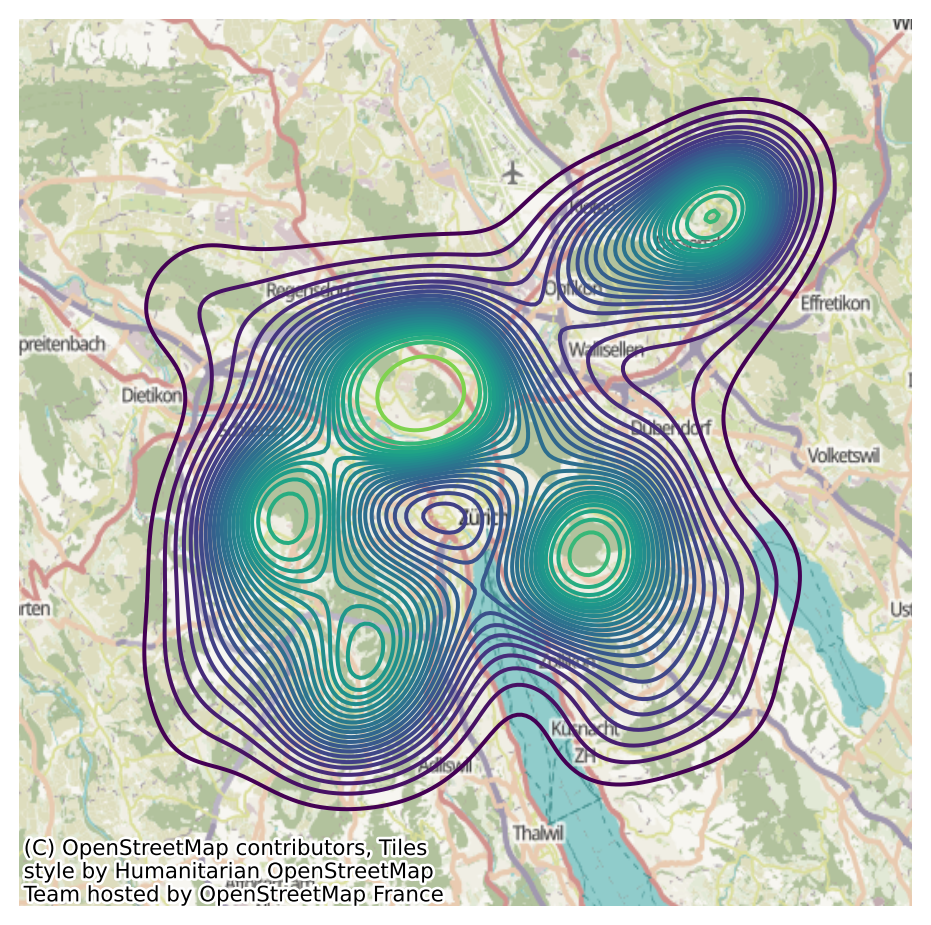 crs = 2056)Mit der Erweiterung seaborn lassen sich mit wenigen Zeilen Code eine Kernel Density rechnen und visualisieren. Siehe nachstehenden Code: