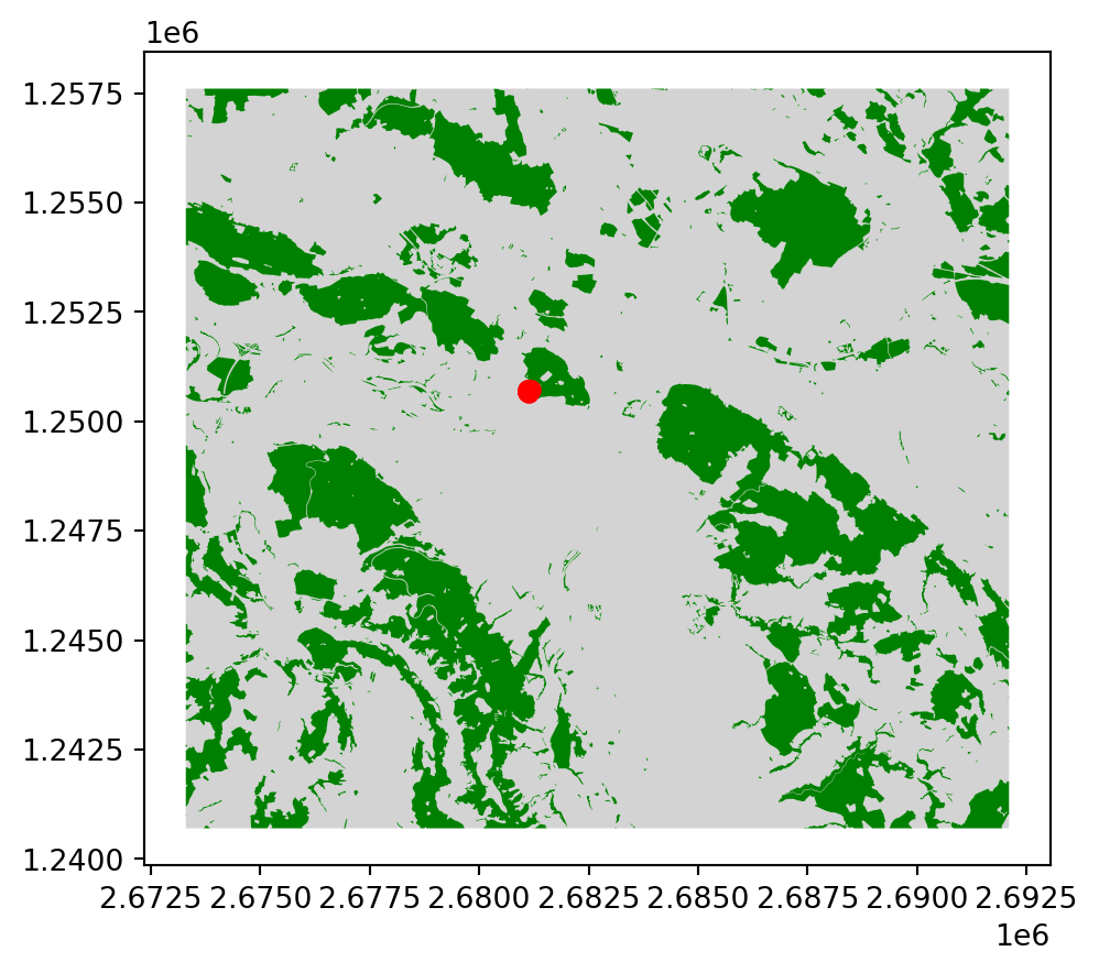 Anders gesagt: Wir wissen ja, dass mit den Spalten x und y Koordinaten in der Schweiz gemeint sind, Python hingegen wusste das bisher (noch) nicht. Der konkrete Raumbezug fehlt also noch und das wird irgendwann problematisch: Denn bald wollen wir für jeden simulierten Zeckenstich ermitteln, ob er sich im Wald befindet oder nicht. Das ist eine explizit räumliche Abfrage, welche nur mit explizit räumlichen Geodaten beantwortet werden kann.