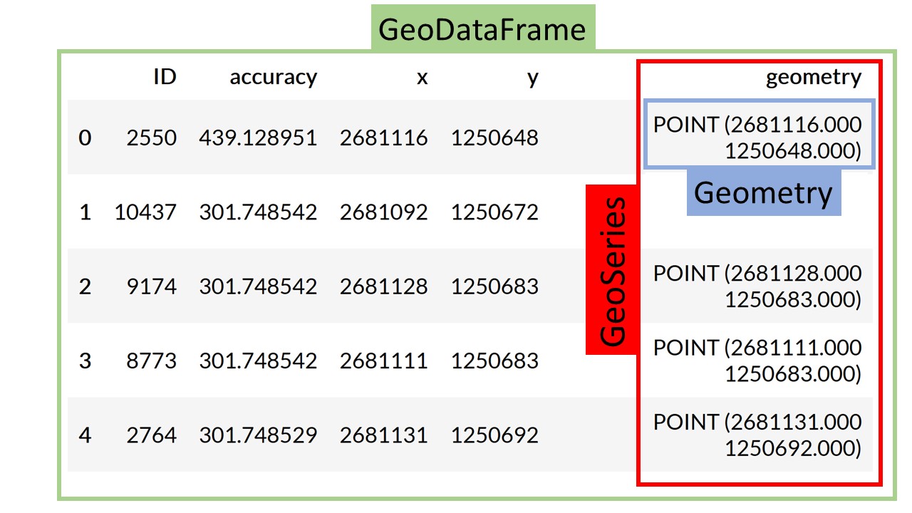 An dieser Stelle ist es wichtig, die drei Hierarchiestufen von GeoDataFrames zu kären. Von “unten” nach “oben” erläutert gibt es folgende Stufen: