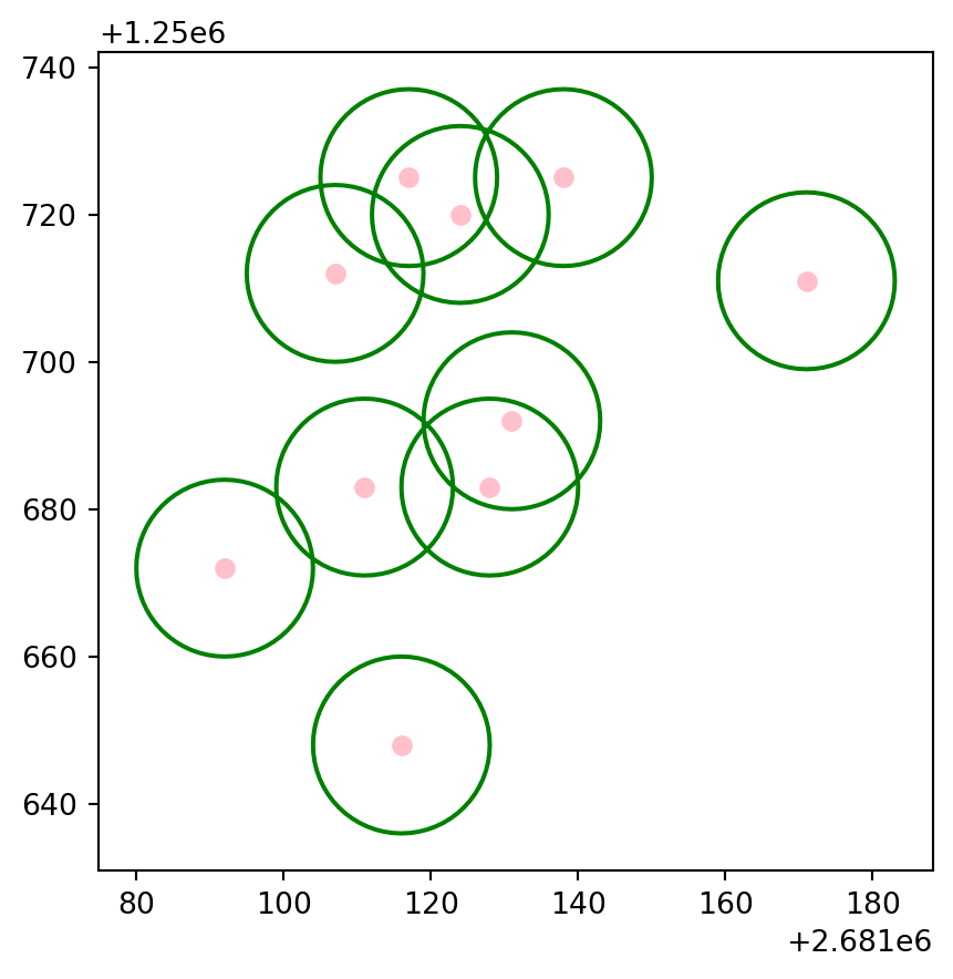 # Nicht interaktiv:from matplotlib import pyplot as pltfig, ax = plt.subplots()zeckenstiche_buffer_outline.plot(ax = ax, color ="green")zeckenstiche_gpd.plot(ax = ax, color ="pink")