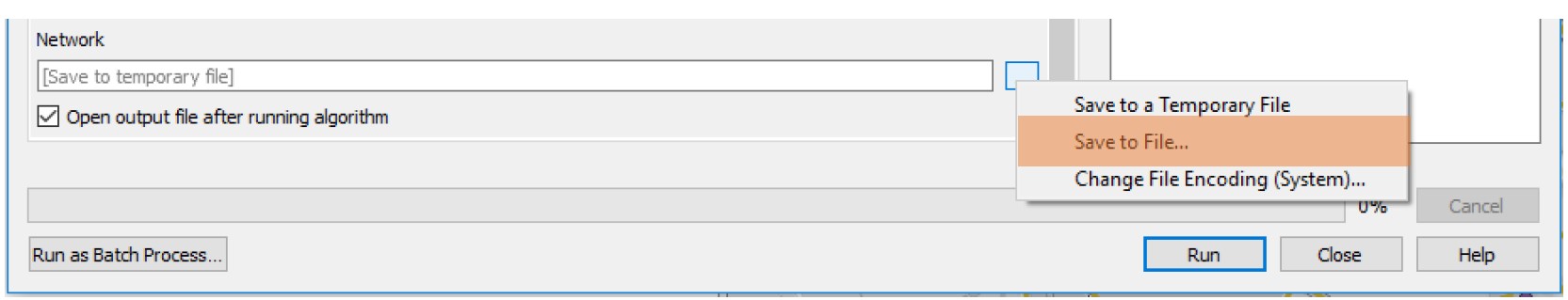 Standartmässig werden Dateien als temporäre Files abgespeichert, die nach dem Schliessen von QGIS gelöscht werden. Um einen Output an einem festgelegten Ort abzuspeichern muss der Output definiert werden. Dazu klickt man neben [Save to temporary file] auf die drei Punkte und wählt “Save to File” aus.